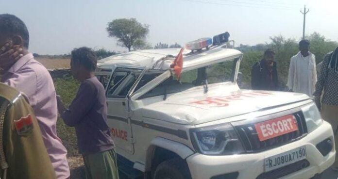 बूंदी में मंत्री के प्रोटोकॉल में तैनात एस्कॉर्ट गाड़ी को ट्रेलर ने मारी टक्कर, इसी टक्कर से 4 जवान हुए घायल ।